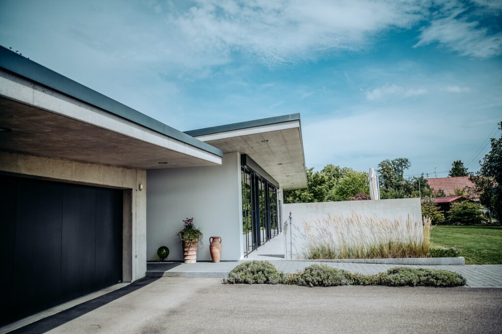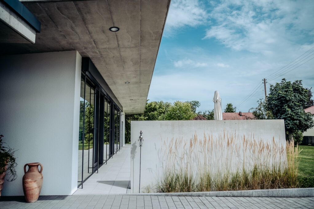 Für dieses Projekt haben wir die Wünsche des Auftraggebers umgesetzt, ein ebenerdiges Wohngebäude mit lichtdurchfluteten Räumen zu realisieren. Der gezielte Einsatz von Sichtbeton verleiht dem Gebäude eine moderne Note. Besonders die geneigten Sichtbetondecken schaffen nicht nur visuelle Höhe, sondern tragen auch maßgeblich zum einzigartigen Charme des Hauses bei.